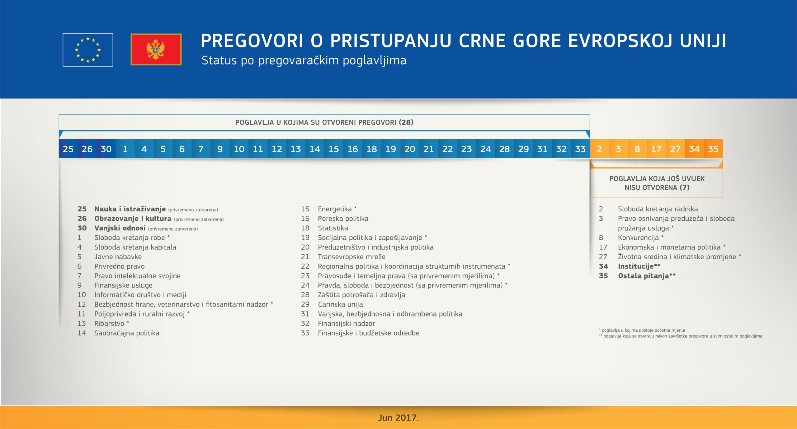 With today’s Conference, out of a total of 35 negotiation chapters, 28 chapters have now been opened for negotiations of which 3 chapters have already been provisionally closed. Further accession conferences will be planned, as appropriate, in order to take the process forward in the second half of 2017. The accession negotiations were launched in June 2012.